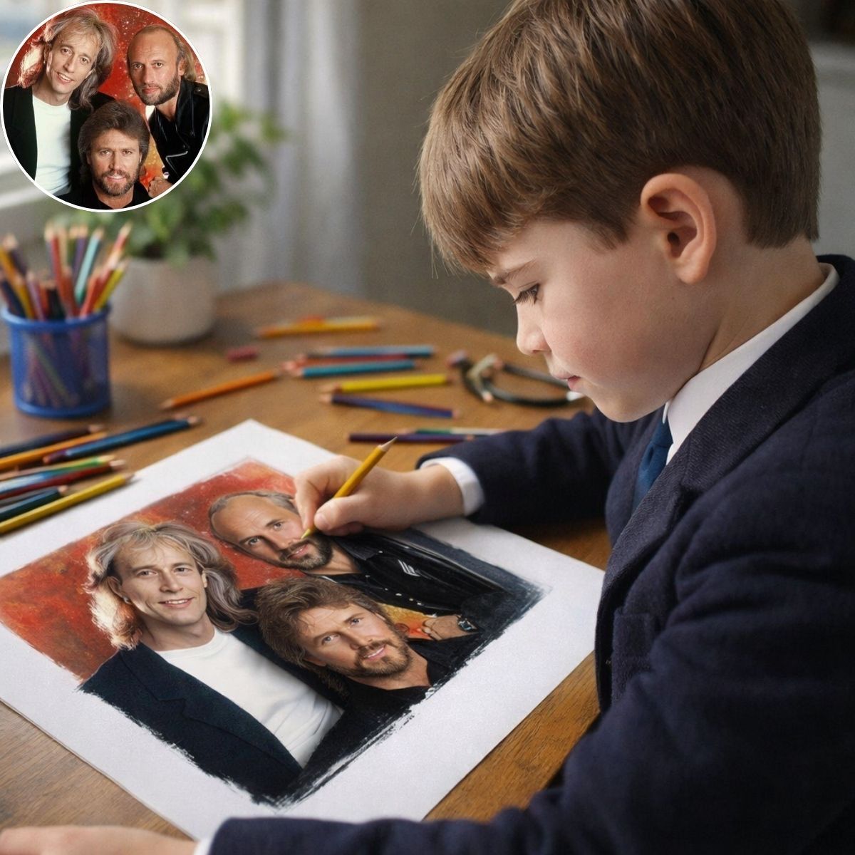 The drawing showed the Bee Gees—three brothers whose music once filled radios, living rooms, and dance floors around the world. The child did not draw them from memory born of experience, but from stories heard, songs shared, and images passed down with care. In those careful strokes lived something remarkable: proof that great music does not disappear. It waits.