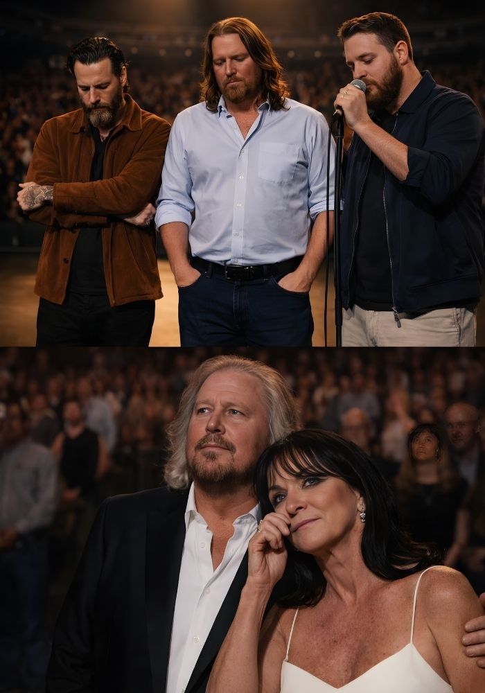 As the three sons lifted their voices together, the emotion became impossible to contain. Barry Gibb and Linda Gray Gibb watched in silence, eyes fixed on the stage, hearts visibly overwhelmed. It wasn’t just a performance. It was a living moment of family, memory, and gratitude unfolding in real time.