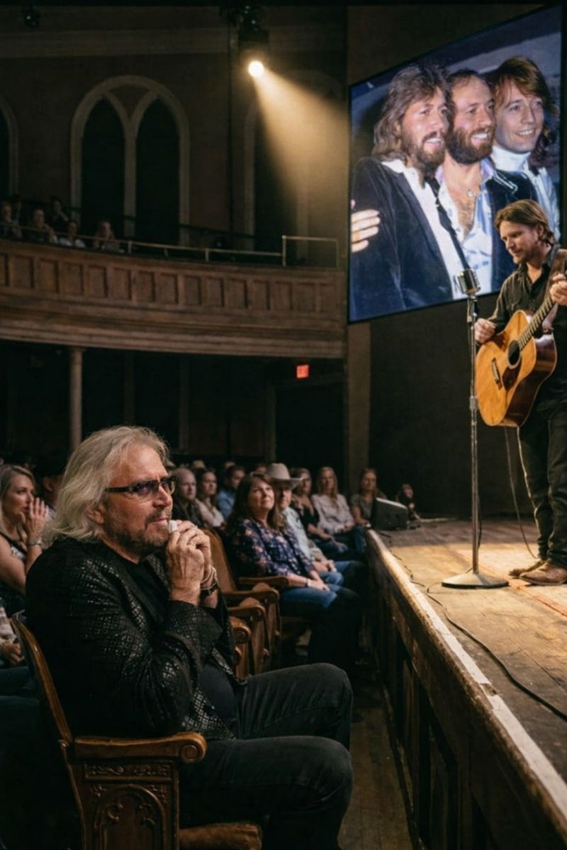 The camera, which had been focused on the singer, slowly shifted toward the audience. What it revealed caused an audible gasp to ripple across the room. Sitting quietly among the crowd, unannounced and unnoticed until that instant, was Barry Gibb himself. He was not reacting outwardly. He was not smiling, applauding, or gesturing in any way. He simply sat there, still and attentive, absorbing every word.
