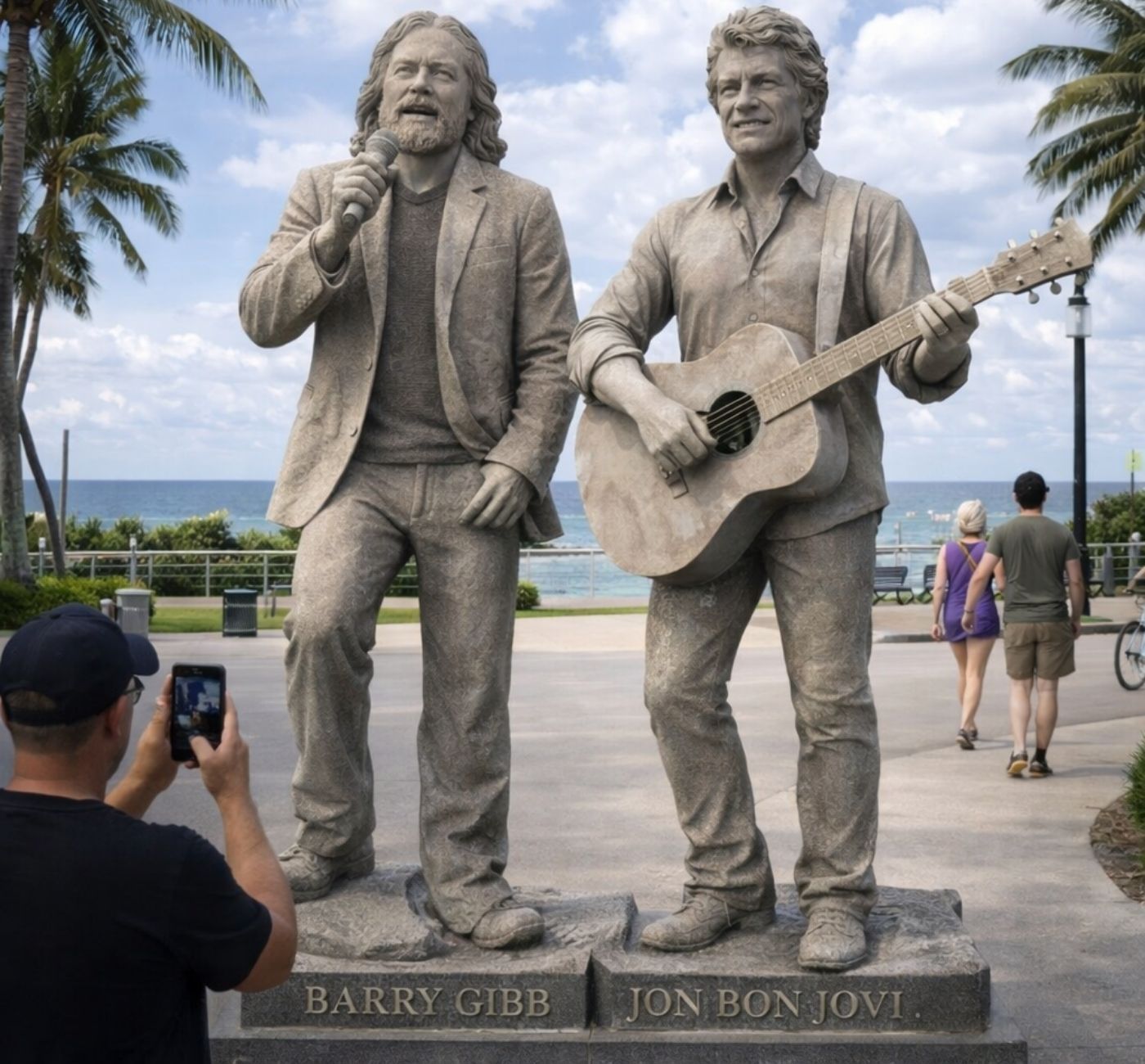 The statues honor two unmistakable figures in modern music history: Barry Gibb and Jon Bon Jovi. Cast in a calm, reflective posture, the figures stand side by side, not in performance poses, but in quiet stillness. There are no plaques, no donor names, no official explanation. Just presence.