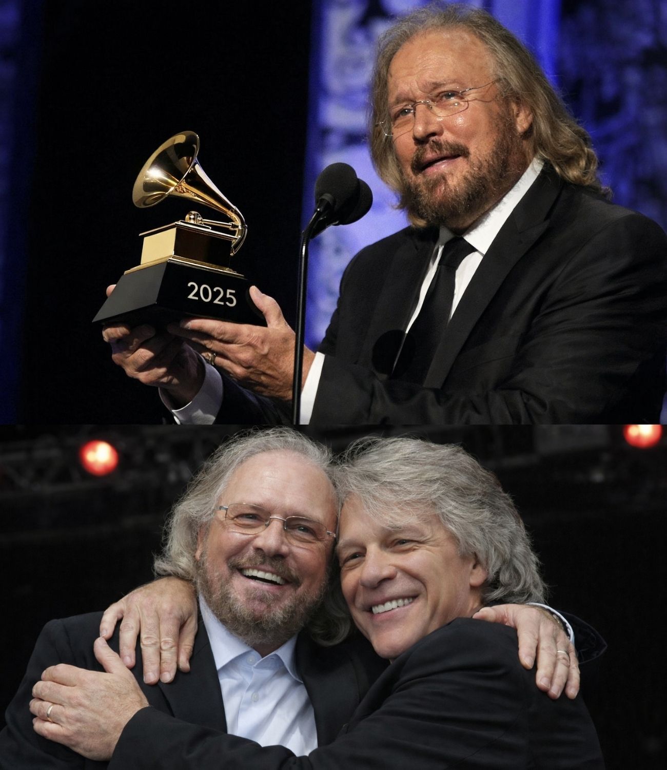 SHOCKING MOMENT — The Unforgettable Second No One Can Fully Describe: As Barry Gibb’s Name Echoed Across the 2025 Grammy Stage, Jon Bon Jovi Stepped Forward, Wrapped Him in a Quiet Embrace, and What Barry Shared Through His Emotion Left the Room Wondering…