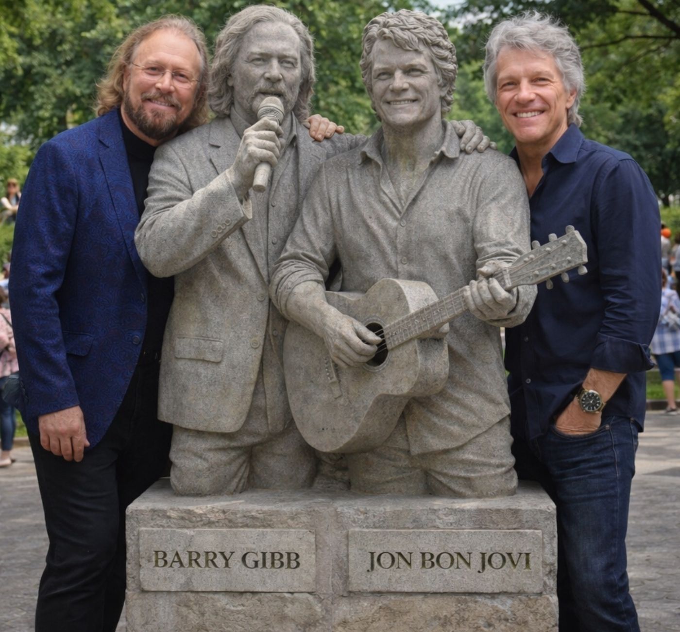 Just moments ago, an ordinary morning in Miami turned extraordinary. Passersby moving through a quiet city park slowed, then stopped entirely, confronted by an unexpected sight: two newly placed statues, standing side by side in silent tribute to Barry Gibb, now 80, and Jon Bon Jovi, 63. Within minutes, phones were raised, photos were taken, and images began racing across social media at lightning speed.